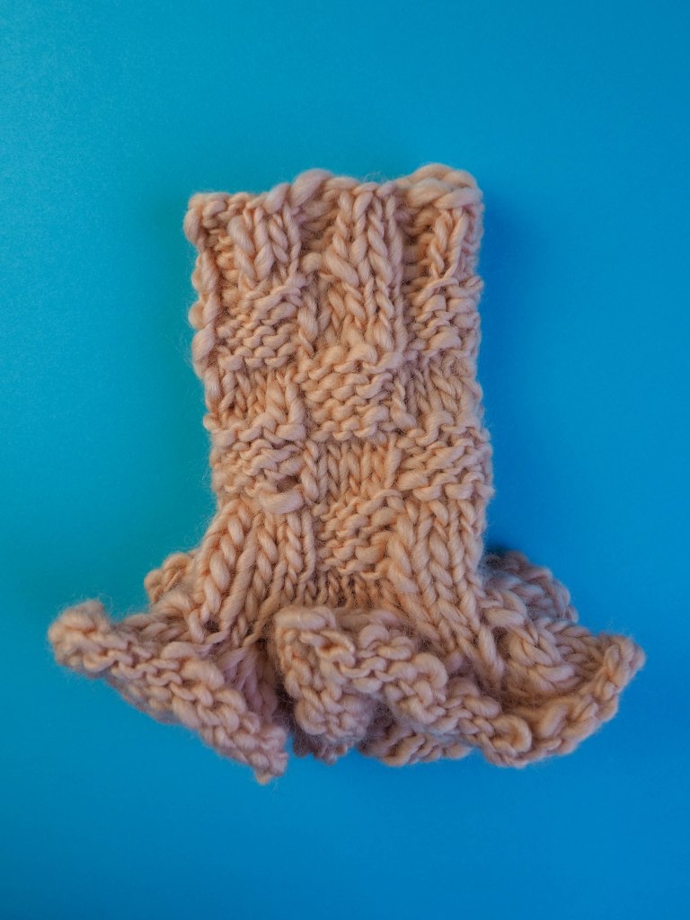 This is such a pretty design. The fingerless hand warmer mittens start off with a frilly trim and are then worked in a lovely check stitch knitting pattern.