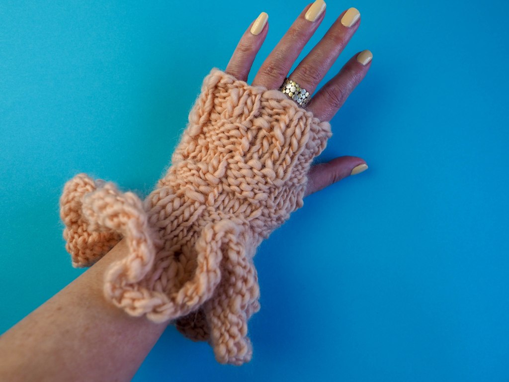 For example, if you need to cast on 50 stitches for the back of a cardigan, cast on 200 stitches. Then simply work stocking stitch for however many rows you want for the frill. The fingerless mitts in the photo above requires 4 rows of stocking stitch.