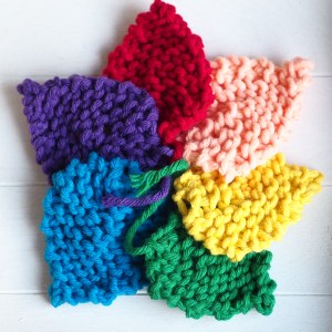 The rainbow leaves shown in this photo were knit on 9mm needles and Paintbox Wool Mix Super Chunky yarn.