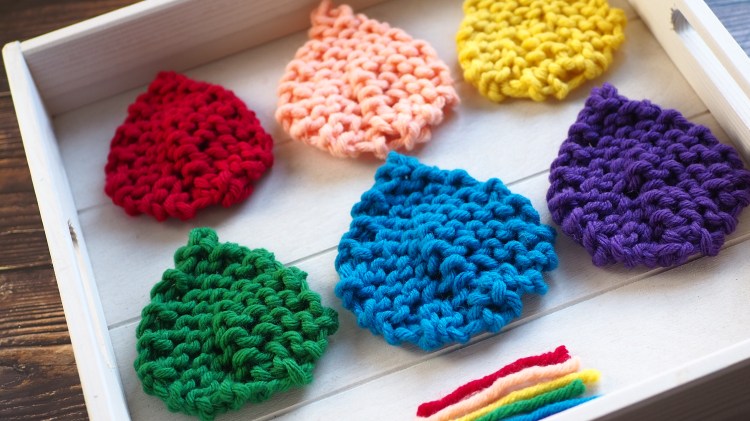 The rainbow leaves shown in this photo were knit on 9mm needles and Paintbox Wool Mix Super Chunky yarn.