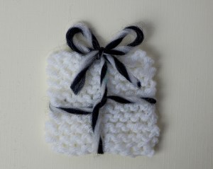 Simply cast on 10 stitches and knit in plain garter stitch until the piece is square. Cast off and weave in the ends.