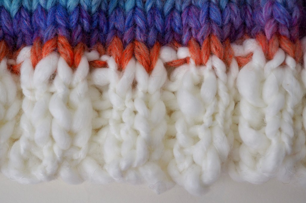 The wrong side will now be facing. Cut the yarn and add in the main colour. Make sure you leave a long tail of yarn for the main colour to help with sewing up the hat later.