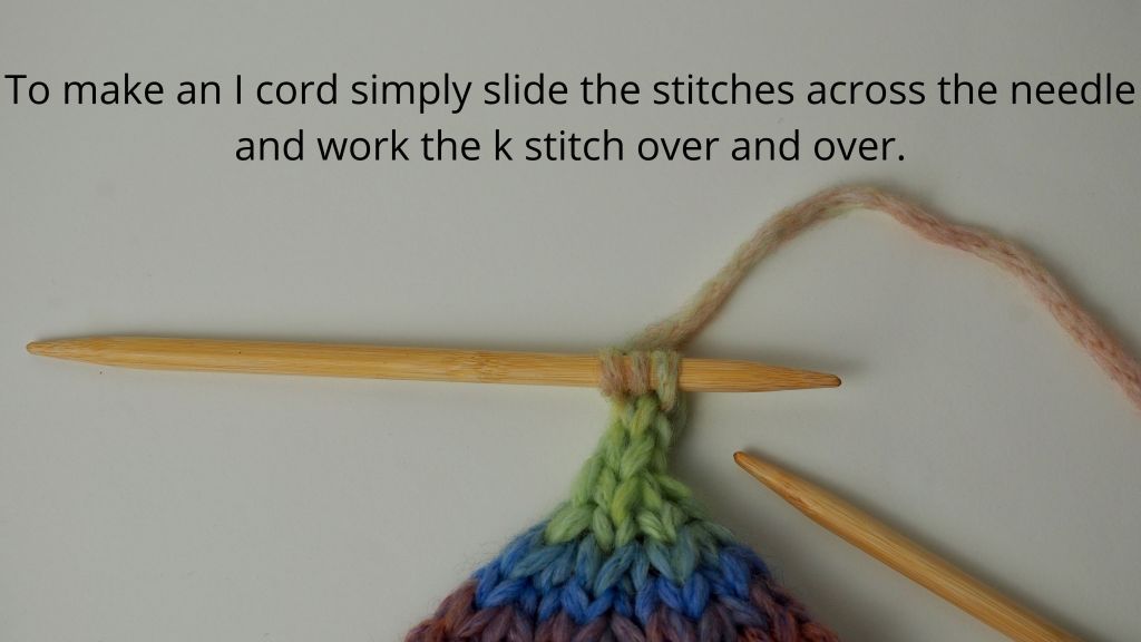 We are now going to create an I cord. With the double pointed needle, (k2tog) three times, thus leaving 3 stitches on your needle.