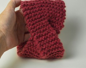 You then knit another strip until it matches the first one. The strips are then simply crossed over and rejoined. The headband is then knit until desired length, cast off and then the seams are joined together.