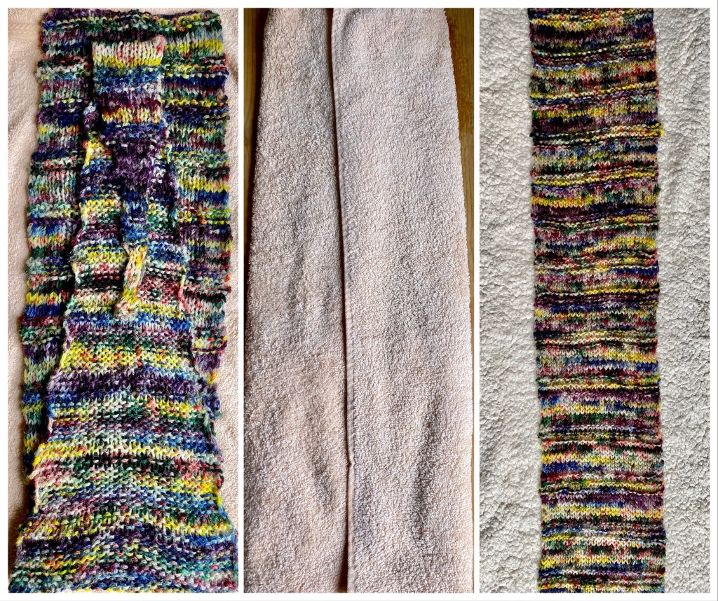 - The photo below shows the scarf being placed on the towel, then wrapped and squeezed, then laid out flat on the floor to dry.