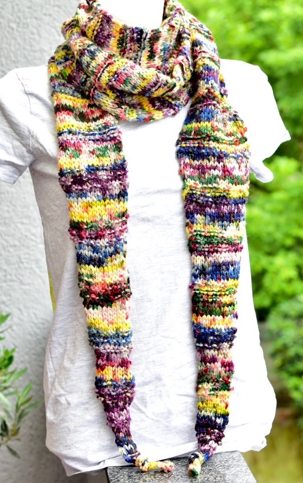 Once your scarf is dry, you can wear it with pride and wait for the compliments! We tied knots at each end for a nice detail. You could add a tassels or even sew on bells if you wanted to!