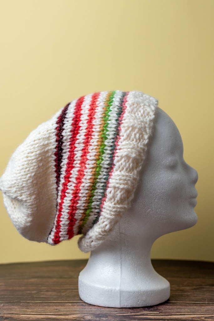 This is a very easy beanie hat to knit. The stripes are worked in self striping yarn – this means that you get a very attractive rainbow stripe effect without having to keep on changing yarns. This way of knitting stripes also saves an awful lot of time at the end of the project as there are very few yarn ends to sew in.
