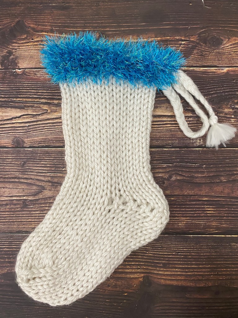 The boot is made using super chunky yarn, and is knit flat on two needles.