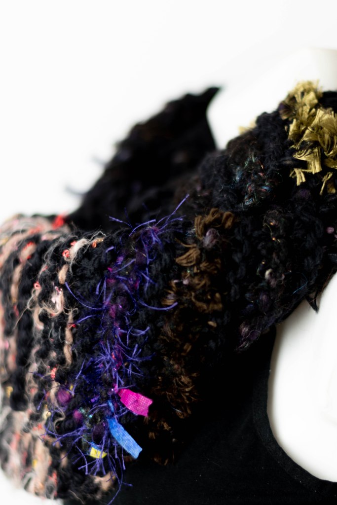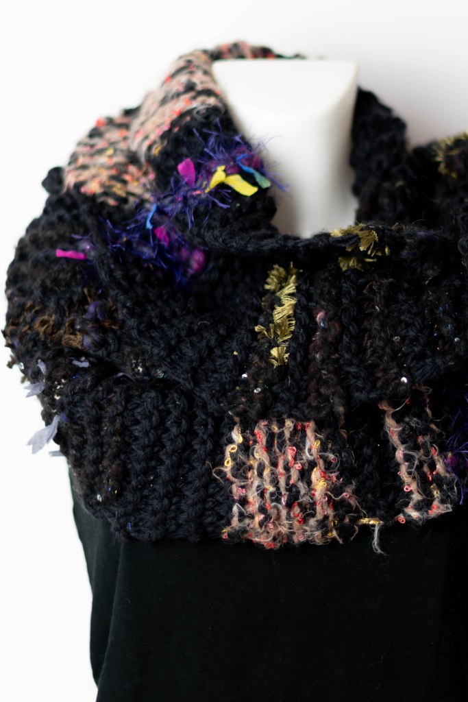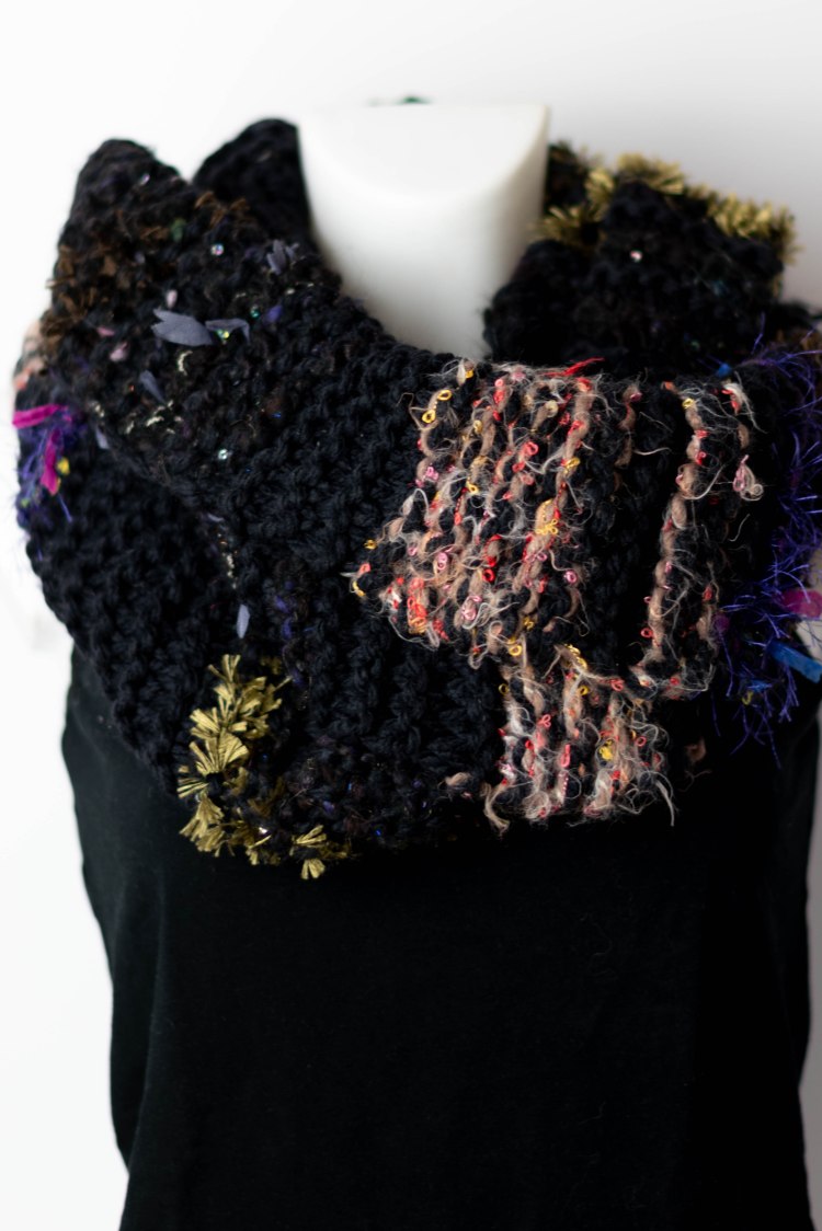 I used a plain black yarn, and added in random stripes of leftovers. The leftovers were mainly bits of art yarn/handspun which was purchased from The Fibre Tree on Etsy. The scarf contain ribbons, sequins, and eyelash yarn, thanks to using the leftover art yarns.