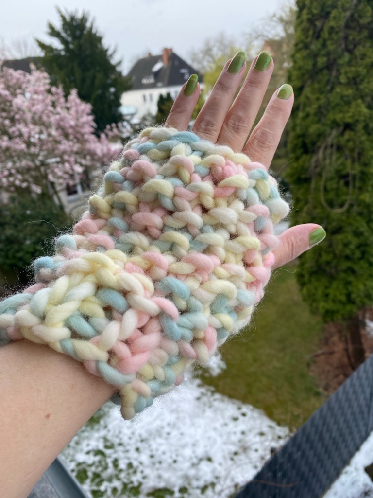 And that’s it – a lovely, fast to knit pair of fingerless super chunky gloves knit in the moss stitch pattern.