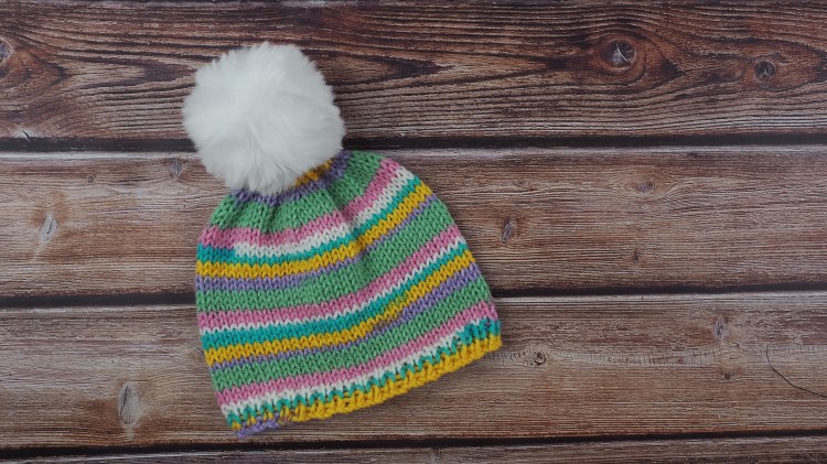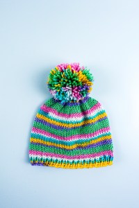 The pompoms are 8cm, so not massive, but I think they are perfect for baby hats. Click here to find the pompoms that I buy if you would like to avoid buying out of shape, rubbish ones. You can see below how the hat might look if you make your own pompom. Looks pretty cool with the self striping yarn!