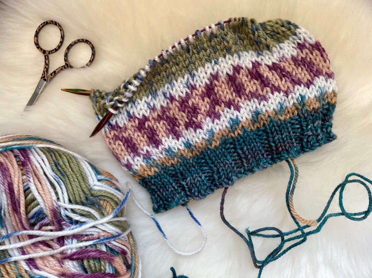 The yarn was a bargain in the sale, and I loved the look of colours. I have started to knit a hat for my mum using this yarn, and as you can see the Fair Isle effect pattern made by the yarn looks so lovely. The colour shown below is called Subtle, by the way. there are two other shades and I may indeed have accidentally ordered all of them…