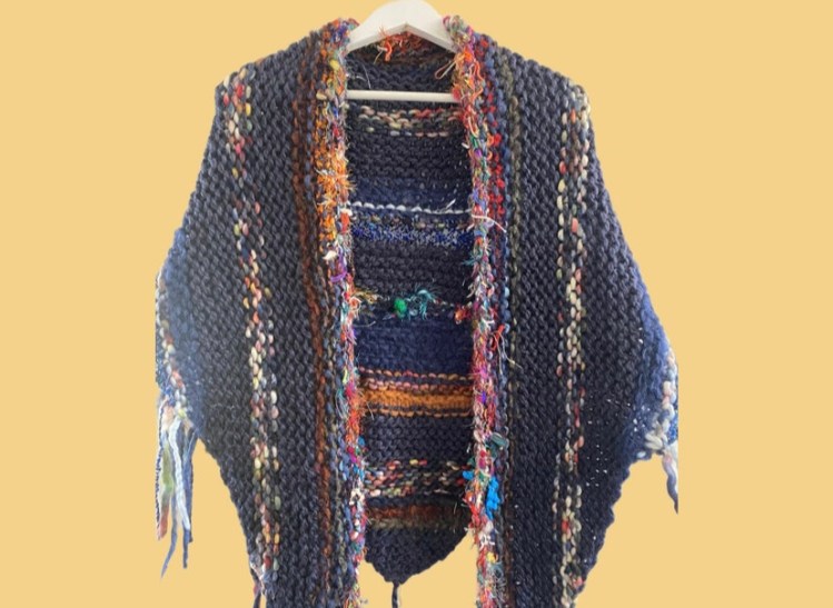 - Approx 300g super chunky or chunky yarn leftovers. There are no rules about how much of each yarn colour or type to use. Just knit freely, changing colours when you wish. My shawl uses different types of yarn. It includes pure wool, acrylic super chunky yarn, and regular chunky yarns. Additionally, it has some artisan handspun yarn. I used super chunky, chunky and even a small amount of aran worsted yarn to make my shawl. The differing thicknesses and textures are what gave it the charm and boho look. You can add fashion yarns like eyelash to your shawl knitting project if you like.