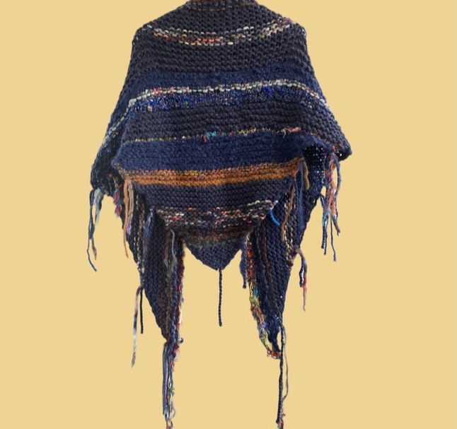 The shawl is worked in a triangle from bottom to top. Change yarns whenever you wish, at the beginning and ends of rows. You can leave the join in knots on show if you want. You can also tie on some extra tassels at the end. This garment has an indie, boho look. There are no strict rules, and the ends are not sewn in, unless you wish to do so.